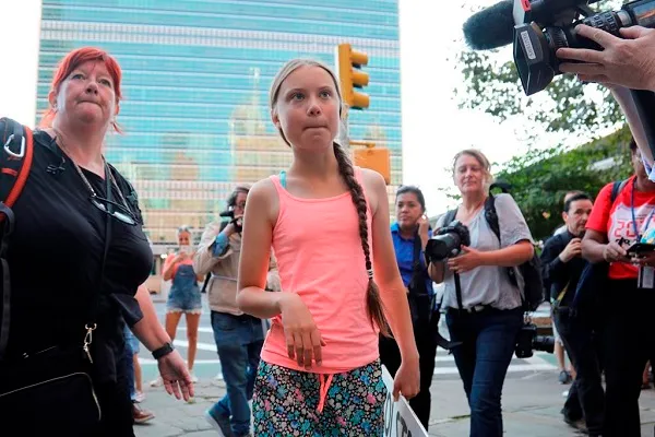 Hàng trăm người biểu tình, đa số là các thiếu niên, vây quanh Thunberg bên ngoài tổng hành dinh của Liên Hợp Quốc cùng hô vang các khẩu hiệu về sự nóng lên toàn cầu.