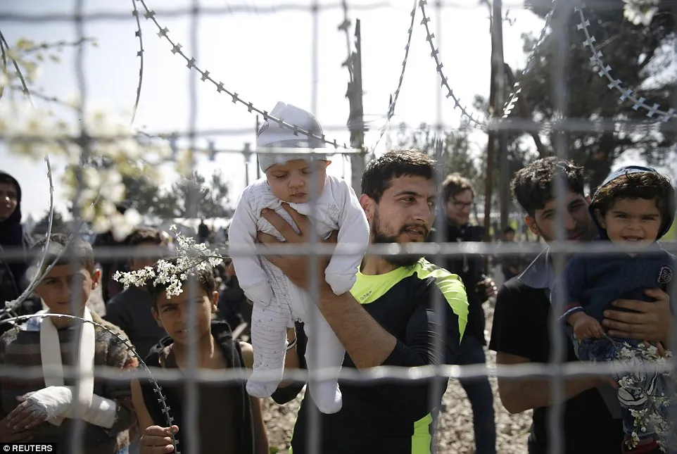 Họ nâng những em bé lên cao ngay cạnh hàng rào thép gai mong những người bảo vệ biên giới Macedonia … đoái thương, cho phép họ vượt qua hàng rào và tiếp tục cuộc hành trình vào châu Âu.