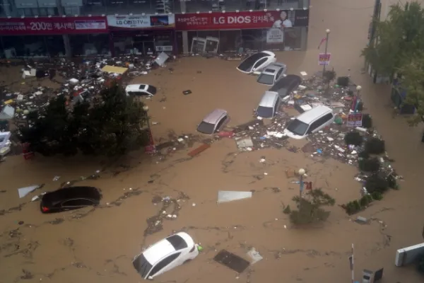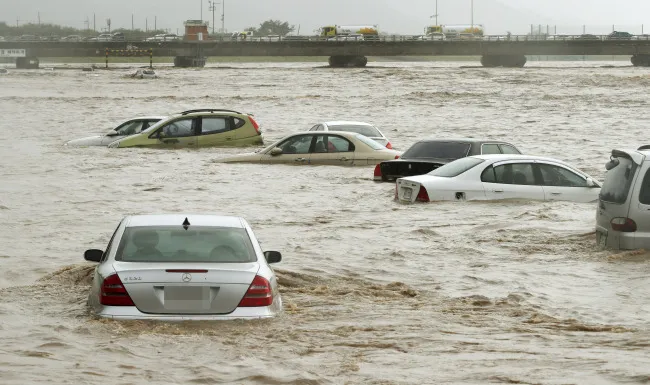 Xe ô tô trôi nổi trong nước sau khi bão tấn công vào Gyeongju, tỉnh Gyeongsang vào thứ tư (Ảnh: Yonhap)