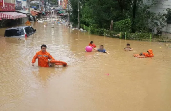 Nhân viên cứu hộ đi bộ trong lũ (Ảnh: Yonhap)