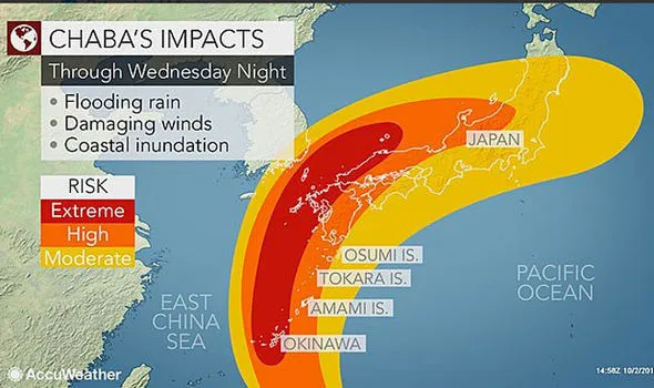 Bão Chaba đang tiến về phía Nhật Bản. Nhà chức trách ở Tokyo đã ban hành cảnh báo bão và mưa hôm thứ Tư với sức gió giảm còn 177km/ giờ, nhưng vẫn rất nguy hiểm.