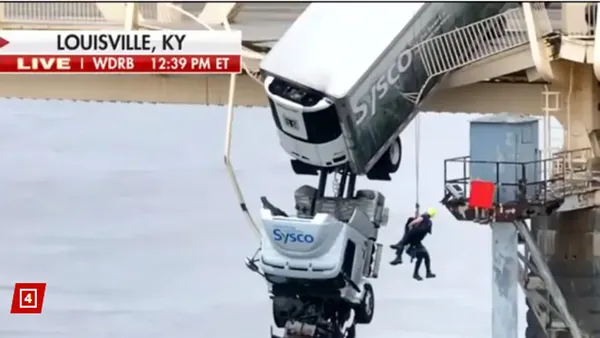 Người lái một chiếc xe container Sysco đã được lực lượng cứu hỏa kéo lên thành cầu an toàn hôm thứ Sáu vừa sau một vụ va chạm giao thông trên cầu khiến chiếc xe container đâm qua thành cầu và treo lơ lửng trên sông Ohio, Mỹ.