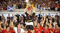 Các cầu thủ Tây Ban Nha giương cao cúp vô địch. |