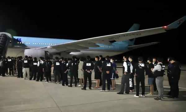 Các công dân Hàn Quốc liên quan hoạt động lừa đảo sử dụng công nghệ được bàn giao tại sân bay quốc tế ở thủ đô Phnom Penh, Campuchia - Ảnh: AKP