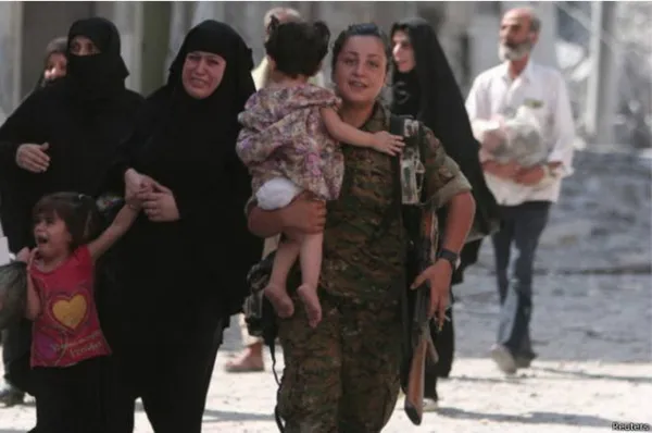 Nữ chiến binh SDF an ủi những người dân chạy trốn khỏi Manbij - Nguồn: Reuters
