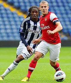 | Wilshere đi bóng trước sự đeo bám của cầu thủ West Brom Romaine Sawyers. |