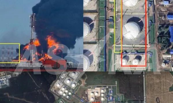 Lửa và khói đen bốc lên từ một cơ sở trong hệ thống đường ống dẫn dầu Druzhba nằm sâu trong lãnh thổ Nga (ảnh trái) và ảnh vệ tinh với vị trí bị tấn công được đánh dấu - Ảnh: TELEGRAM/ASTRA