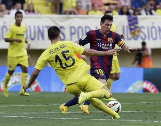 Victor Ruiz của Villarreal cản pha đi bóng của Messi khi 2 đội gặp nhau hồi tháng 8 năm ngoái. Ảnh: Reuters