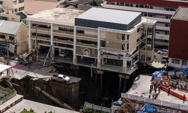 Hố tử thần xuất hiện gần công trường xây dựng tuyến tàu điện ngầm mới Vajira Station, ngay trước Bệnh viện Vajira - Ảnh: AFP