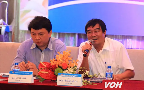 Phó Chủ tịch VFF Nguyễn Xuân Gụ và Tổng thư ký Lê Hoài Anh thông tin cùng báo chí sau cuộc họp.