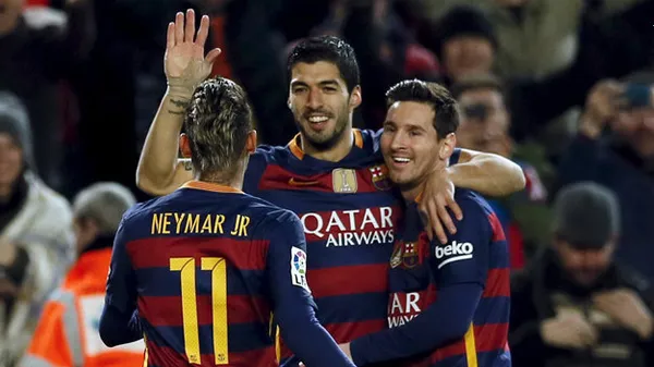 Niềm vui của bô ba 'MNS' sau khi ghi bàn cho Barcelona. Ảnh: Reuters
