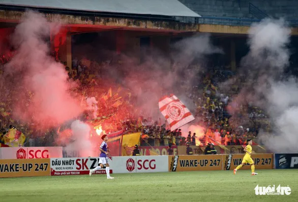 Trước đó, tối 11-9, tại SVĐ Hàng Đẫy trong trận đấu giữa Hà Nội - Nam Định tại vòng 22 V-League, CĐV Nam Định đã bắn pháo sáng từ khán đài B bắn sang khán đài A rơi trúng đùi trái và làm chị Tô Huyền Anh nhà báo, công tác tại báo Nhi Đồng bị bỏng nặng