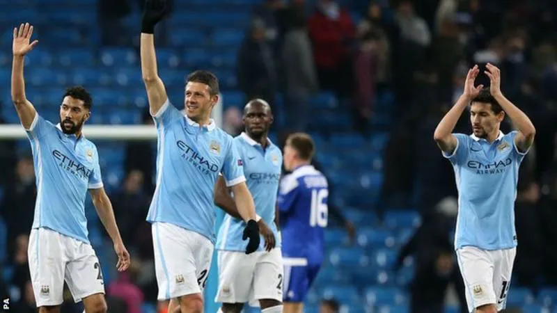 Các cầu thủ Man City ăn mừng chiến tích vượt qua Dynamo Kiev để lần đầu góp mặt ở tứ kết Champions League.