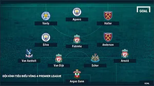 Đội hình tiêu biểu vòng 4 Ngoại hạng Anh được bố trí theo sơ đồ 4-3-3 gồm có: Vị trí người gác đền thuộc về thủ thành Angus Gunn (Southampton); Hàng phòng ngự với sự góp mặt của Trent Alexander-Arnold (Liverpool), Virgil Van Dijk (Liverpool), Fabian Schar (Newcastle United), Patrick van Aanholt (Crystal Palace); Nơi hàng tiền vệ gồm có Felipe Anderson (West Ham), Fabinho (Liverpool), David Silva (Man City); Vị trí tiền đạo thuộc về Jamie Vardy (Leicester City), Sergio Aguero (Man City), Sebastien Haller (West Ham United).