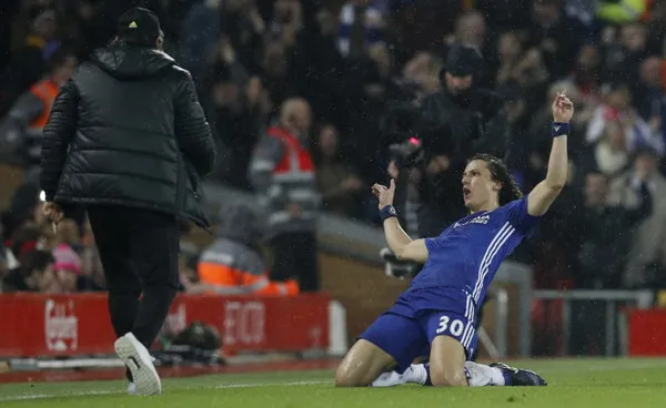 Niềm vui của David Luiz sau khi mở tỉ số cho Chelsea. Ảnh: Reuters