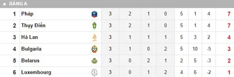 Bảng xếp hạng bảng A sau 3 lượt đấu