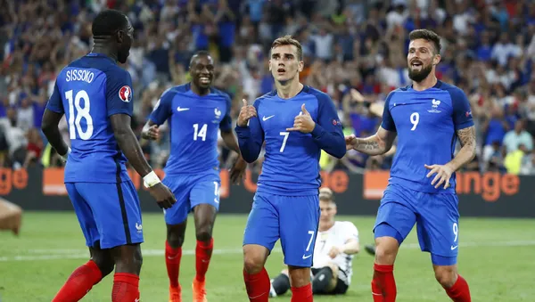 Với lợi thế sân nhà, Pháp tràn đội hình lên tấn công ngay sau tiếng còi khai cuộc. Đến phút 45 của trận đấu Schweinsteiger nhảy lên tranh bóng với Patrice Evra và đã để bóng chạm tay trong vòng cấm. Tuyển Pháp được hưởng một quả penalty. Griezmann đánh lừa được thủ môn Neuer mở tỷ số cho tuyển Pháp.