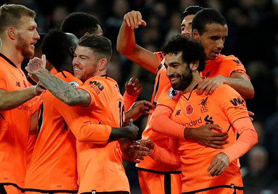 Niềm vui của các cầu thủ Liverpool sau khi Salah nâng tỉ số lên 4-1. Ảnh: Reuters