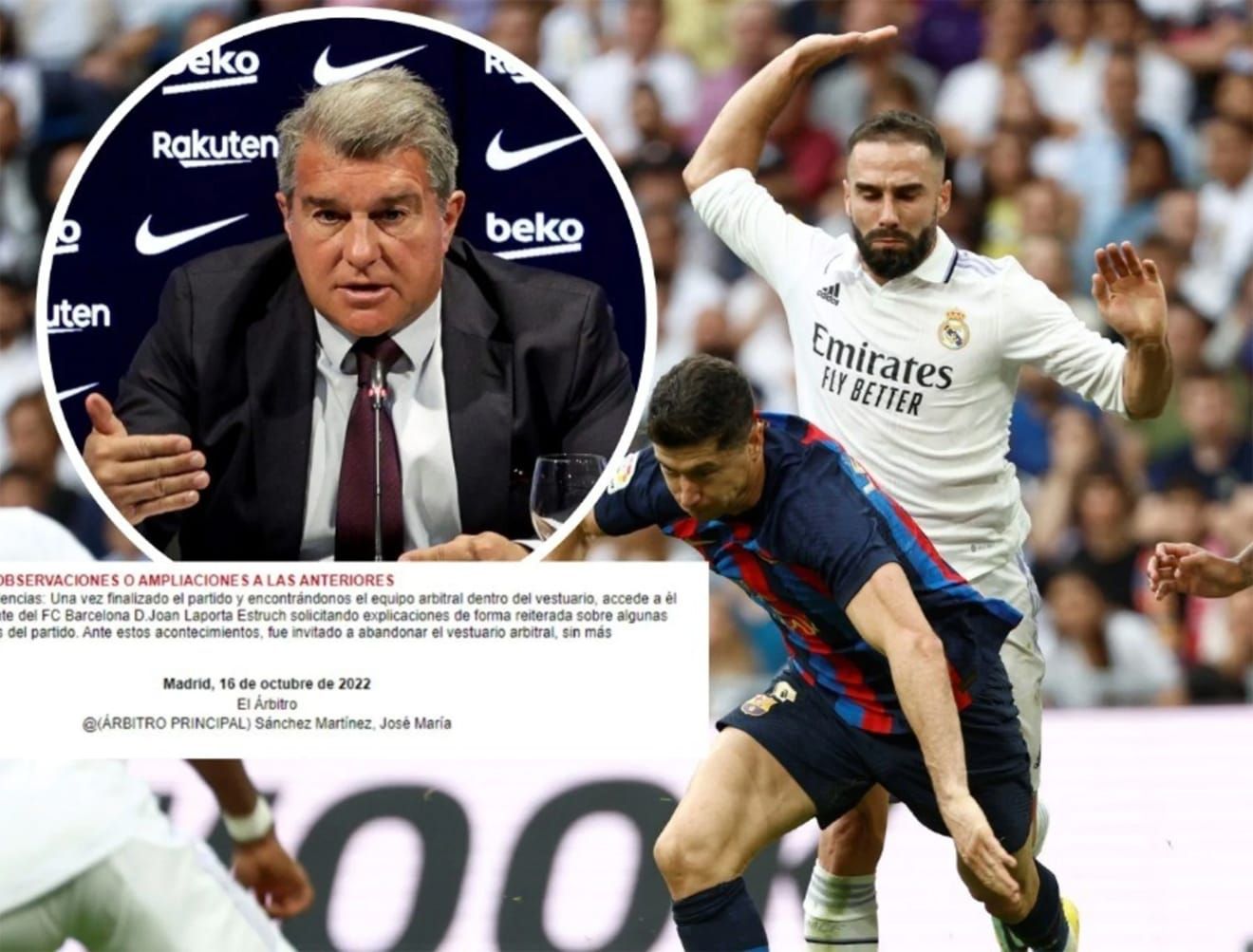 Theo thông tin từ tờ Marca, Laporta yêu cầu trọng tài chính Sanchez Martinez giải thích về tình huống tiền đạo Lewandowski bị Dani Carvajal đẩy ngã trong vòng 16m50 nhưng Barca không được hưởng phạt đền. Bên cạnh đó pha bóng Eric Garcia va chạm với Vinicius Junior cũng được nhắc tới.