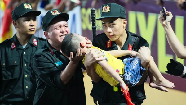 Gần cuối trận đấu, một bé trai bất ngờ bị ngất ở khu vực khán đài B. Chiến sĩ PCCC Trần Quang Đạt đã kịp thời phát hiện, sơ cứu rồi chuyển cháu bé cho lực lượng tiếp ứng dưới sân.