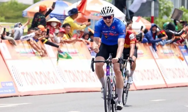 Dzianis mừng chiến thắng chặng 24 cuộc đua xe đạp xuyên Việt tranh Cup Truyền hình HTV 2026, trưa 28/4 - Ảnh: Vnexpress