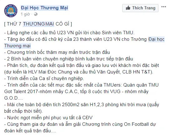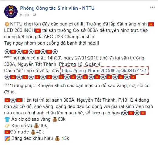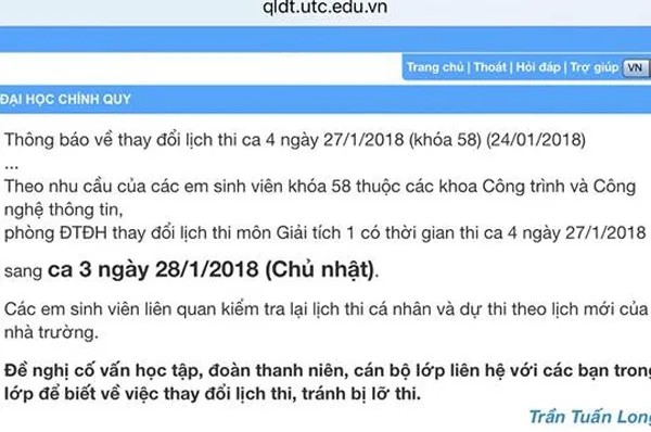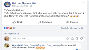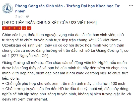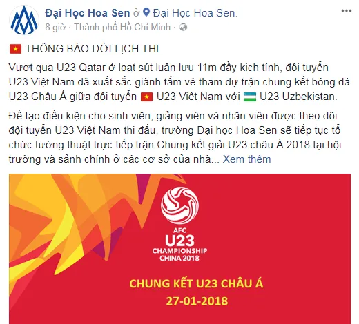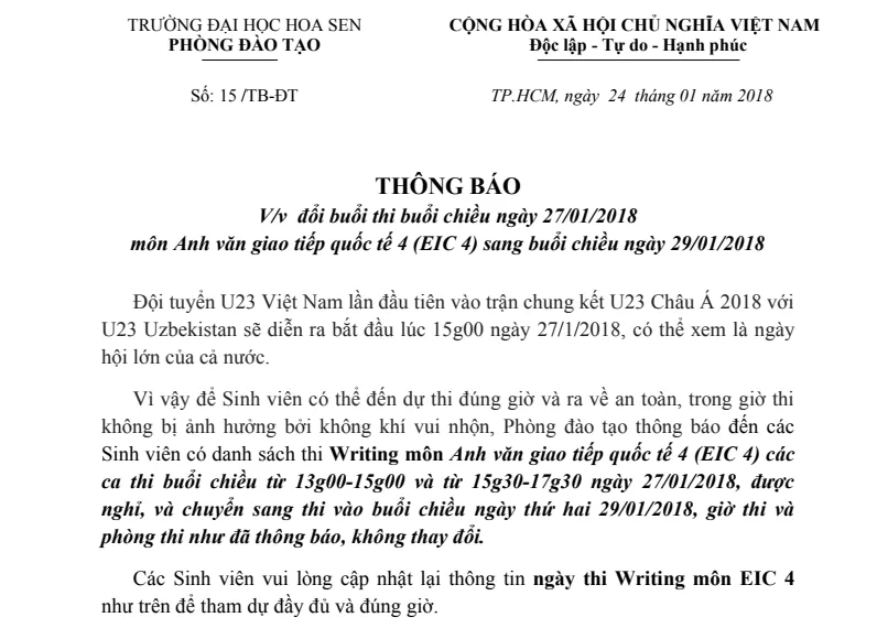 Trường ĐH Hoa Sen (TPHCM) thông báo dời lịch thi viết môn Anh văn giao tiếp quốc tế dự kiến diễn ra chiều ngày 27/1 sang ngày 29/1, vì trùng với thời gian đội tuyển U23 Việt Nam đá trận chung kết.