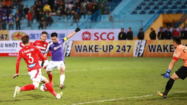 Thủ quân của Hà Nội FC không bỏ lỡ cơ hội nhân đôi cách biệt trong tình huống đối mặt. Ảnh: Như Đạt.