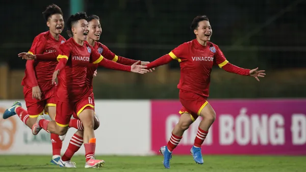 Niềm vui của Biện Thị Hằng và các đồng đội khi ghi bàn đầu tiên tại vòng bán kết giải nữ Cúp quốc gia 2020.