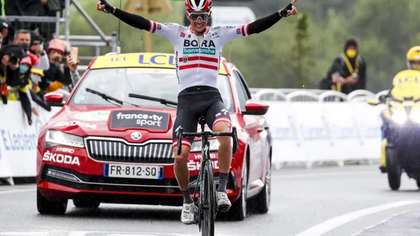 Tuy cuộc chiến áo vàng vẫn tiếp tục diễn ra với kịch bản quen thuộc nhưng chặng đua này vẫn đáng xem với những nỗ lực của nhóm đi đầu. Còn khoảng 36km, Patrick Konrad (Bora-Hansgrohe) mạnh dạn tách toán để vượt lên một mình đầu đoàn đua, mạo hiểm đổ dốc với tốc độ cao bất chấp cơn mưa khiến đường trơn trượt. Có lúc, anh tạo được khoảng cách hơn 1 phút với nhóm rượt đuổi mình.