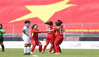 Các cô gái Việt Nam vui mừng với bàn thắng. Ảnh: SN.