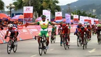 Tay đua Nguyễn Thành Tâm (áo xanh trắng) tung nước rút dũng mãnh để về nhất chặng đua vòng quanh TP Lạng Sơn.