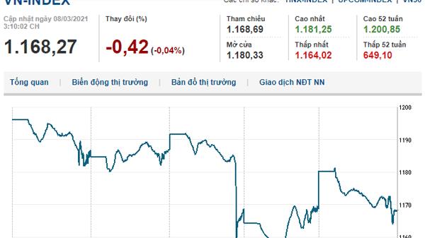 Kết phiên 8/3, VN-Index giảm 0,42 điểm (0,04%) xuống 1.168,27 điểm, HNX-Index tăng 3,61 điểm (1,39%) lên 263,42 điểm, UPCoM-Index tăng 0,86 điểm (1,09%) lên 79,42 điểm.