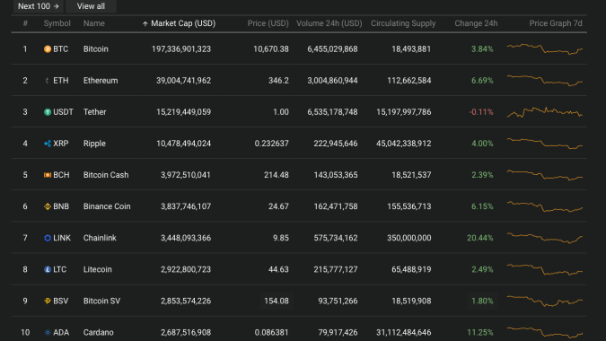 Giá Bitcoin hôm nay 25/9 ghi nhận vào thời điểm 10h00, tăng mạnh lên 10.670,85, tăng 3,85% so với 24h qua.