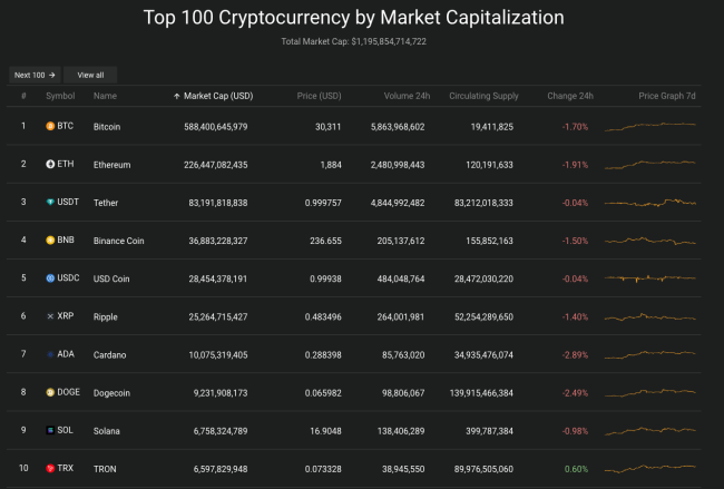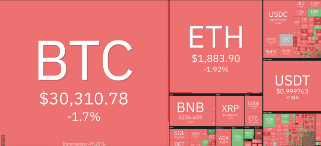 Giá Bitcoin hôm nay 26/6 ghi nhận vào thời điểm 11h30, giảm mạnh xuống mức 30,310.78 giảm mạnh 1,7% so với hôm qua.