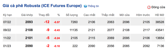 Khảo sát phiên giao dịch sáng ngày 9/6, giá cà phê Robusta tại London giao tháng 7/2022 giảm 12 USD/tấn ở mức 2.093 USD/tấn. Trong khi đó trên sàn New York, giá cà phê Arabica giao tháng 7/2022 quay đầu tăng 2,80 cent/lb, ở mức 234,65 cent/lb.