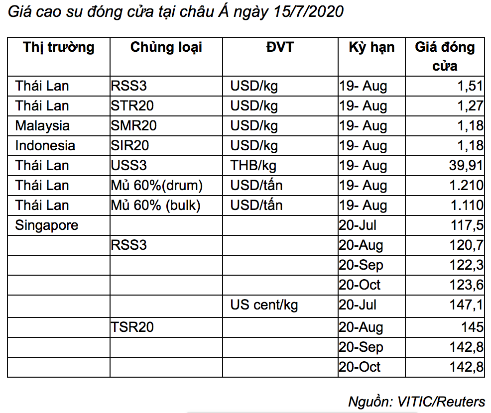 Tại Sàn giao dịch hàng hóa tương lai Thượng Hải (SHFE), ngày 30/6, giá cao su RSS3 giao kì hạn tháng 7/2020 giao dịch ở mức 10.085 NDT/tấn (tương đương 1,42 USD/kg), giảm 0,2% so với cuối tháng 5/2020 và giảm 10,3% so với cùng kìnăm 2019.
