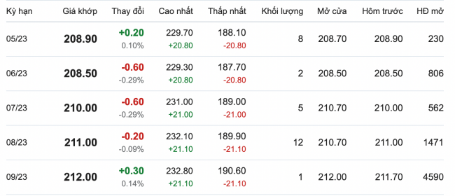 Tại Sở giao dịch hàng hóa Tokyo, giá cao su ngày 19/5/2023, lúc 14h30, kỳ hạn tháng 7/2023, ghi nhận mức 212 JPY/kg, tăng nhẹ 0,3 yên, tương đương 0,14%.