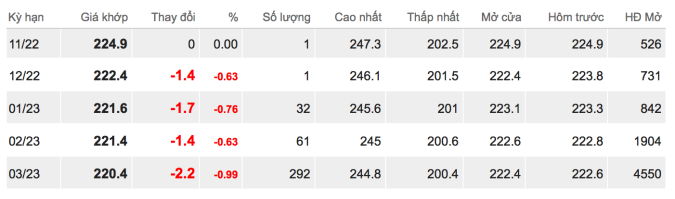 Tại Sở giao dịch hàng hóa Tokyo, giá cao su ngày 26/10/2022, lúc 11h00, kỳ hạn tháng 3/2023, ghi nhận mức 220,4 JPY/kg, giảm mạnh 2,2 yên, tương đương 0,99%.