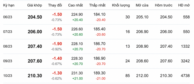 Tại Sở giao dịch hàng hóa Tokyo, giá cao su ngày 9/6/2023, lúc 14h30, kỳ hạn tháng 10/2023, ghi nhận mức 210,3 JPY/kg, giảm mạnh 1,3 yên, tương đương 0,62%.