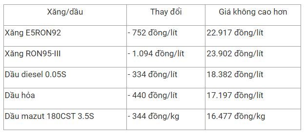 Theo đó, xăng RON 95 được điều chỉnh giảm 1.094 đồng/lít, xăng E5 RON 92 giảm 752 đồng/lít. Sau điều chỉnh, mức giá bán lẻ tối đa với xăng E5 RON 92 là 22.917 đồng/lít và RON 95 là 23.902 đồng/lít.
