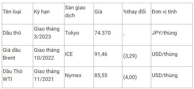 Chốt phiên giao dịch ngày 14/10, giá dầu thô Brent giảm 3,1% xuống 91,36 USD/thùng, trong khi giá dầu WTI của Mỹ giảm 3,9% xuống 85,61 USD.