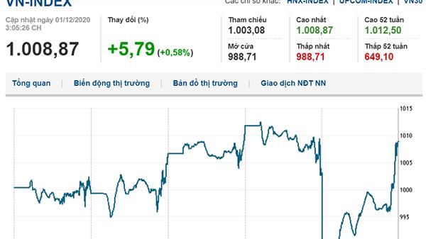 Đóng cửa phiên 1/12, VN-Index tăng 5,79 điểm (0,58%) lên 1.008,87 điểm, HNX-Index tăng 1,23 điểm (0,83%) lên 148,93 điểm, UPCoM-Index tăng 0,91 điểm (1,36%) lên 67,81 điểm.