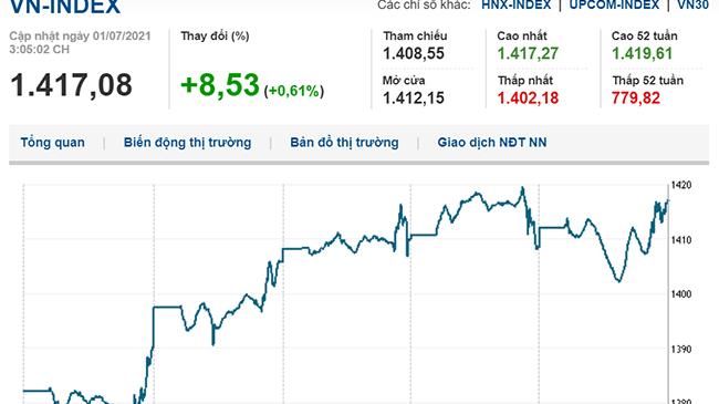 Đóng cửa phiên 1/7, VN-Index tăng 8,53 điểm (0,61%) lên 1.417,08 điểm, HNX-Index tăng 0,74% lên 325,72 điểm, UPCoM-Index tăng 0,2% lên 90,44 điểm.