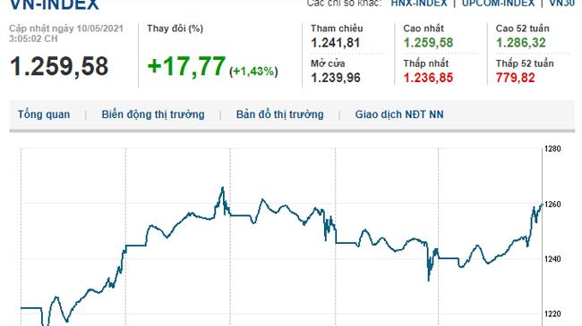 Kết phiên 10/5, VN-Index tăng 17,77 điểm (1,43%) lên 1.259,58 điểm, HNX-Index tăng 0,41 điểm (0,15%) đạt 280,27 điểm, UPCoM-Index giảm 0,01 điểm (0,01%) xuống 80,84 điểm.