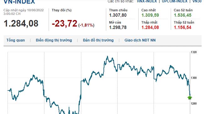 Kết phiên 10/6, VN-Index giảm 23,72 điểm (1,81%) còn 1.284,08 điểm, HNX-Index giảm 6,3 điểm (2,01%) về 306,44 điểm, UPCoM-Index giảm 1,17 điểm (1,23%) xuống 93,72 điểm.