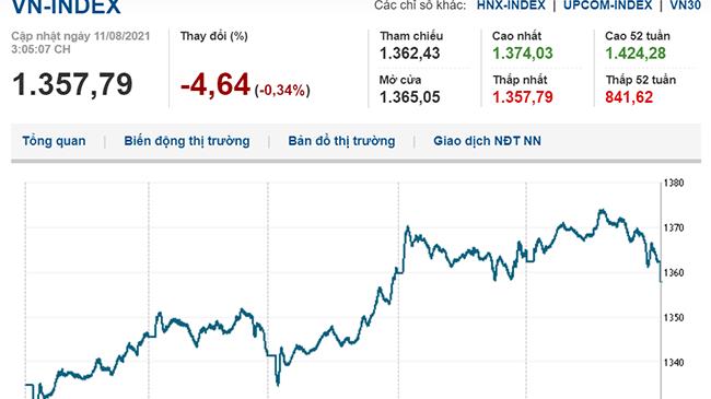 Đóng cửa phiên 11/8, VN-Index giảm 4,64 điểm (0,34%) còn 1.357,79 điểm, HNX-Index giảm 0,63 điểm (0,19%) còn 334,44 điểm.