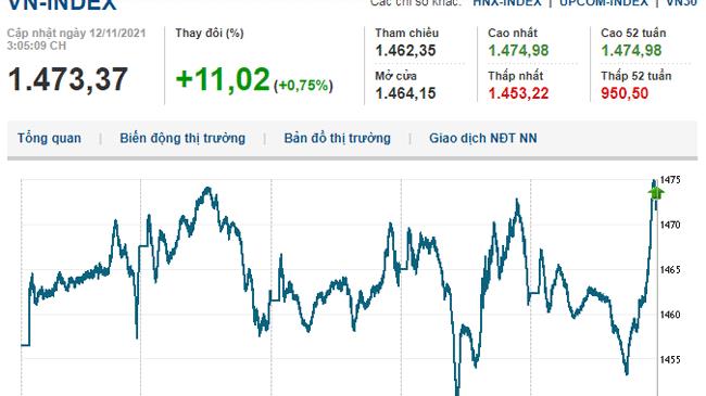Kết phiên 12/11, VN-Index tăng 11,02 điểm (0,75%) lên 1.473,37 điểm, HNX-Index tăng 2,9 điểm (0,66%) đạt 441,63 điểm, UPCoM-Index tăng 1,45 điểm (1,33%) lên 110,66 điểm.