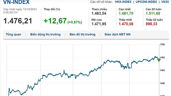 Đóng cửa phiên 13/12, VN-Index tăng 12,67 điểm (0,87%) lên 1.476,21 điểm, HNX-Index tăng 6,81 điểm (1,51%) lên 457,56 điểm, UPCoM-Index tăng 0,49 điểm (0,44%) lên 112,3 điểm.