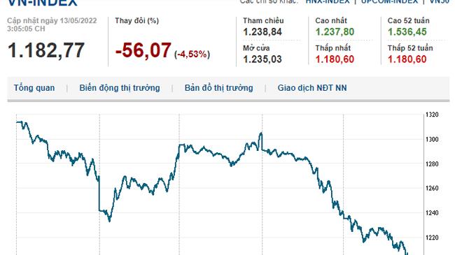 Kết phiên 13/5, VN-Index giảm 56,07 điểm (4,53%) còn 1.182,77 điểm, HNX-Index giảm 13,13 điểm (4,16%) về 302,39 điểm, UPCoM-Index giảm 2,83 điểm (2,93%) về 93,61 điểm.
