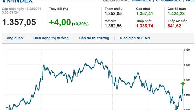 Đóng cửa phiên 13/8, VN-Index tăng 4 điểm (0,3%) lên 1.357,05 điểm, HNX-Index tăng 2,64 điểm (0,79%) lên 336,96 điểm.